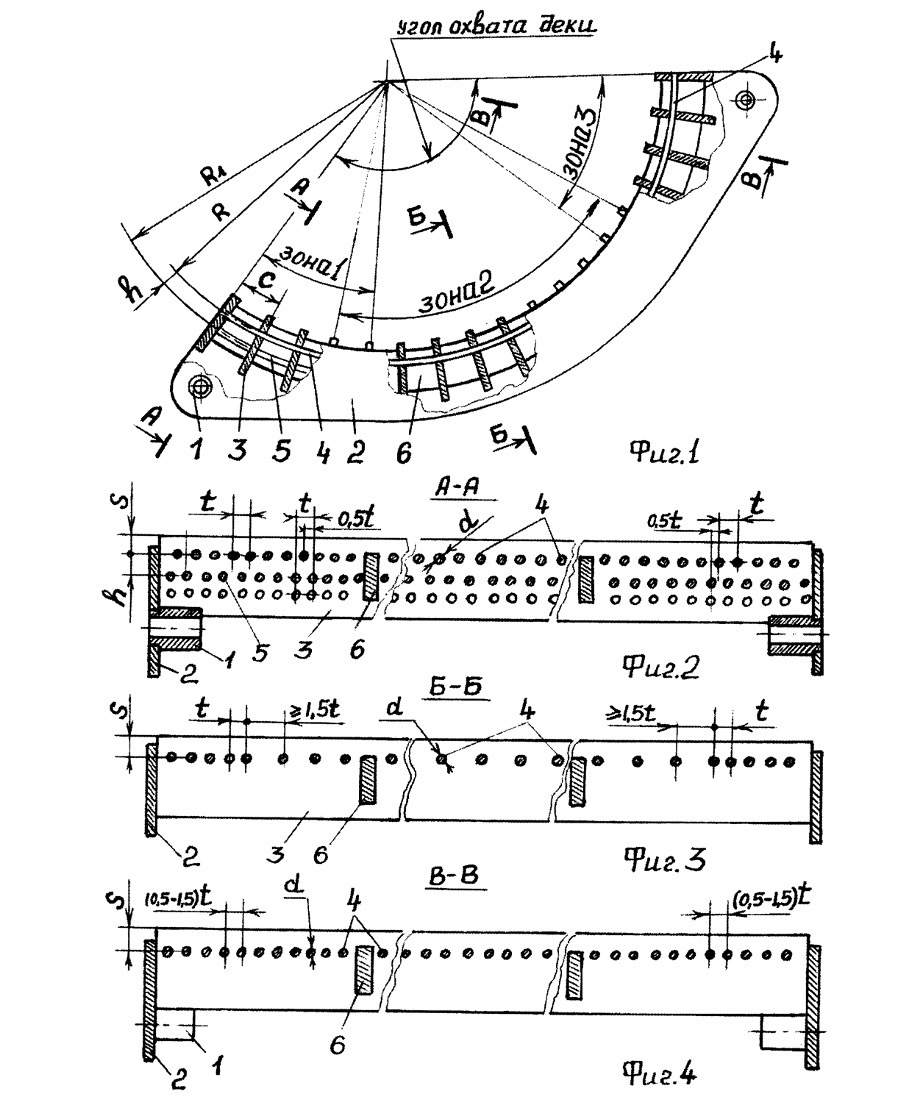 Ниже верхнего основного яруса прутков на больших, чем у основного яруса, радиусах R1, проходящих через середину шага t прутков верхнего яруса 4 с различными интервалами h от 0,75t до 1,25t между осями отверстий верхнего яруса и между собой, расположены три ряда отверстий по всей длине поперечных планок зоны для вариантной установки прутков 5 второго яруса.
