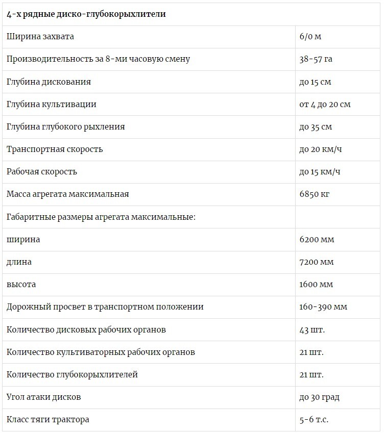 Диско-глубокорыхлители это многофункциональные почвообрабатывающие агрегаты, позволяющие за счет сменных рабочих органов выполнять: дискование почвы на глубину до 150 мм, предпосевную культивацию почвы на глубину 40-120 мм, глубокую культивацию почвы на глубину до 300мм, глубокое рыхление почвы с целью разрушения плужной подошвы на глубину до 480мм.