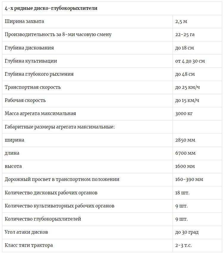 Диско-глубокорыхлители это многофункциональные почвообрабатывающие агрегаты, позволяющие за счет сменных рабочих органов выполнять: дискование почвы на глубину до 150 мм, предпосевную культивацию почвы на глубину 40-120 мм, глубокую культивацию почвы на глубину до 300мм, глубокое рыхление почвы с целью разрушения плужной подошвы на глубину до 480мм.