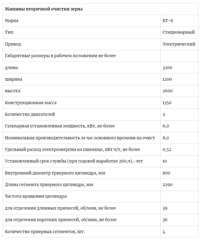 Блок триерный БТ-8 предназначен для: - выделения из зернового (семенного) материала зерновых, колосовых, зернобобовых, масличных и других культур примесей, отличающихся по длине от зерен основной культуры, прошедшего предварительную и первичную очистку на воздушно-решетных машинах. - доведения семян прошедших предварительную, первичную и вторичную очистку на воздушно-решетных машинах приведенных выше культур до посевных качеств. Блок триерный работает в составе технологических линий послеуборочной обработки зерна, а также в составе семяочистительных линий во всех сельскохозяйственных зонах.