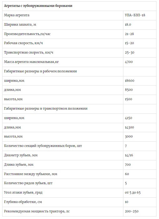 Универсальный почвообрабатывающий агрегат с тяжелыми зубопружинными боронами предназначен для использования при ранневесенней прибивки влаги, боронования с целью подготовки сменного ложа, боронования по посевам, послеуборочного боронования с целью равномерного распределения по поверхности поля пожнивных остатков и частичной их заделки в почву, провоцирования осенних всходов семян сорняков и падалицы, а также обработки паров, заделки гранулированных удобрений и семян при разбросном посеве.
