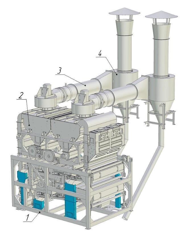 Машина состоит из трёх частей (рис. 1). Это решетная часть 1, воздушная часть 2 и система очистки отработанного воздуха 4. Для перевозки машина разбирается на две части. Решетная часть предназначена для разделения очищаемого зерна и примесей по размерам. С помощью соответствующих размеров отверстий решет зерновой материал может быть рассортирован по толщине, если отверстия прямоугольные или по ширине, если отверстия круглые. Отверстия решет очищаются щетками. Решетная часть способна разделять зерно на 3 или 4 фракции: При разделении решетами на 3 фракции выделяется: