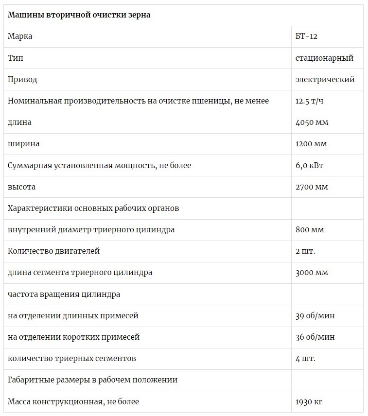 Блок триерный БТ-12 предназначен для: выделения из зернового (семенного) материала зерновых, колосовых, зернобобовых, масличных и других культур примесей, отличающихся по длине от зерен основной культуры. Зерновой материал при этом должен пройти предварительную и первичную очистку на воздушно-решетных машинах. доведения семян прошедших предварительную, первичную и вторичную очистку на воздушно-решетных машинах приведенных выше культур до посевных качеств. Триерный блок работает в составе технологических линий послеуборочной обработки зерна, а также в составе семяочистительных линий. [file]123[/file] 1-овсюжный цилиндр 2-кукольный цилиндр Принцип работы: Материал в составе основного зерна, содержащего длинные и короткие примеси через передний приемник поступает во вращающийся ячеистый триерный цилиндр верхнего модуля (овсюгоотборника) и постепенно перемещается к другому концу цилиндра. При этом триерная поверхность увлекает вверх основное зерно и короткие примеси, уложившиеся в ячейки. Поднявшись вверх, они выпадают в лоток и шнеком выводятся через горловину заднего приемника в нижний модуль (куколеотборник). Длинные примеси оставшиеся внутри цилиндра через задний приемник направляются в течку отхода.